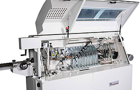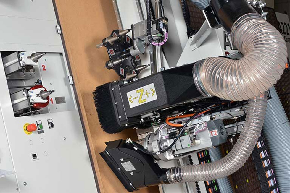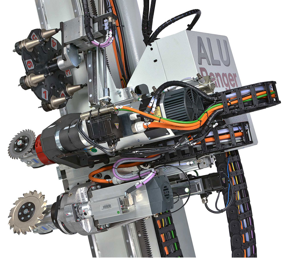 Fräsaggregat mit 7,5KW Spindel, 2 Aggregate zum Sägen und automatischem Werkzeugwechsel-Magazin sowie separater Nutspindel.