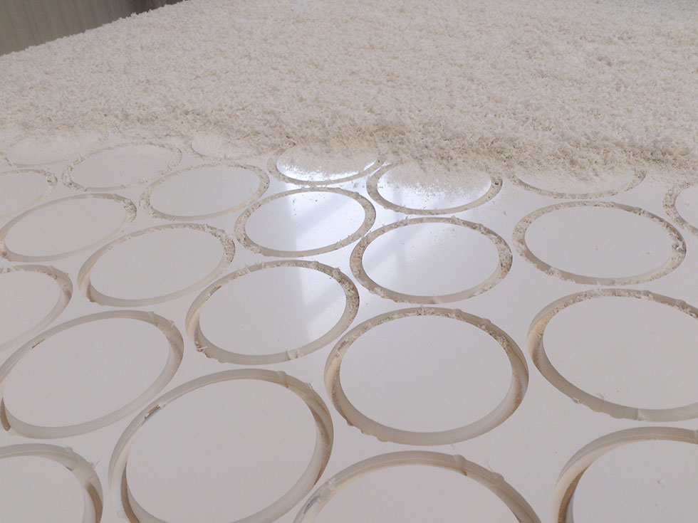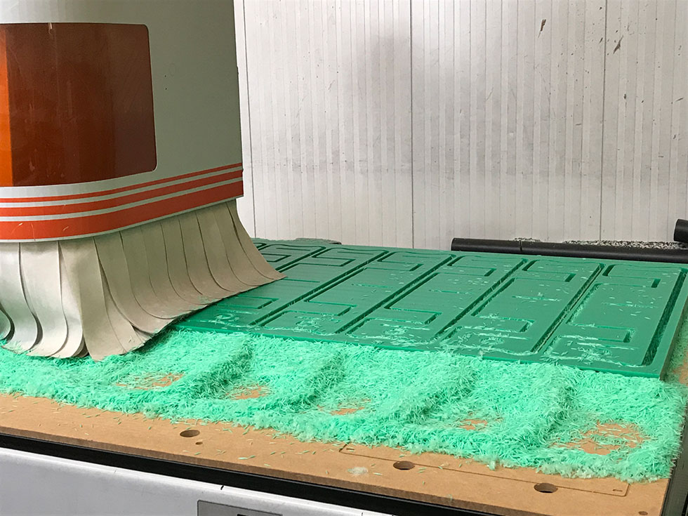 Durchgehender Nesting-Bearbeitungstisch mit Rastereinteilung, 4 Feld Vakuum und 2 Bearbeitungsfelder.