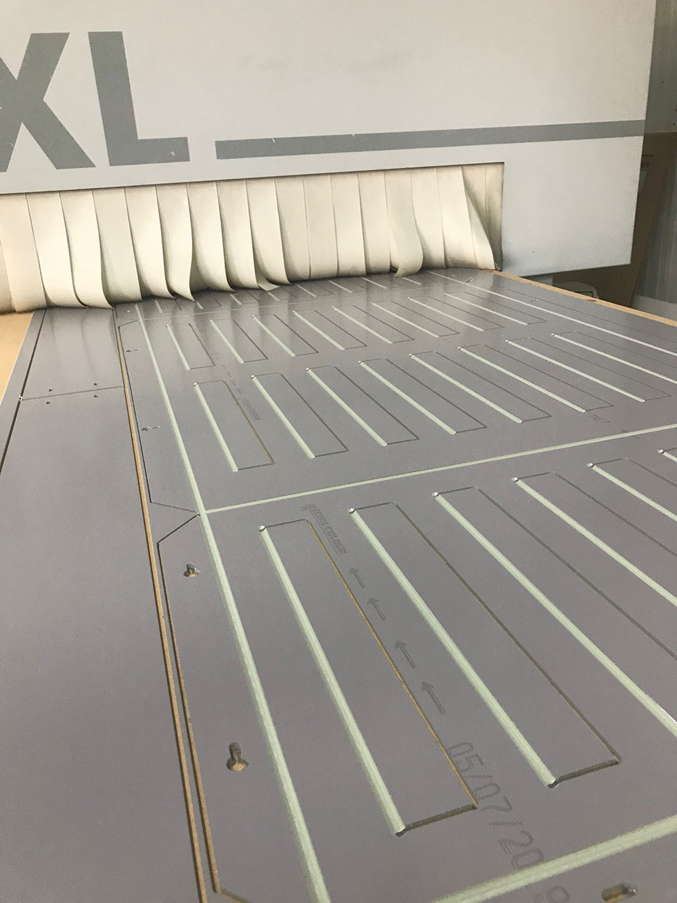 Durchgehender Nesting-Bearbeitungstisch mit Rastereinteilung und 4 Feld Vakuum und 2 Bearbeitungsfelder.