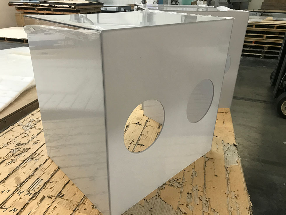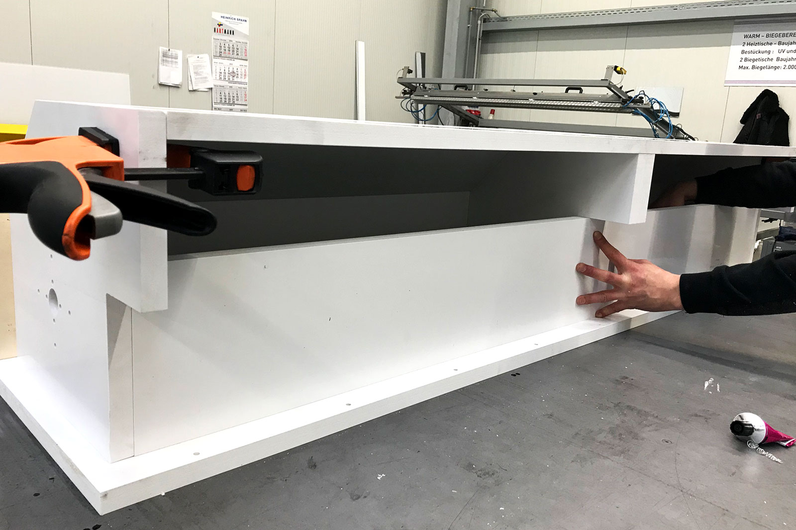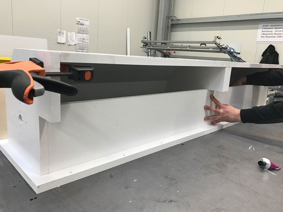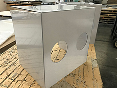 Vor allem bei technischen Verklebungen, bei denen keine optische ( blasenfreie ) Klebenaht gefordert ist, können wir komplexe Fertigteile aus der Kombination Sägen, Fräsen, Lasern, Biegen und Kleben anbieten.