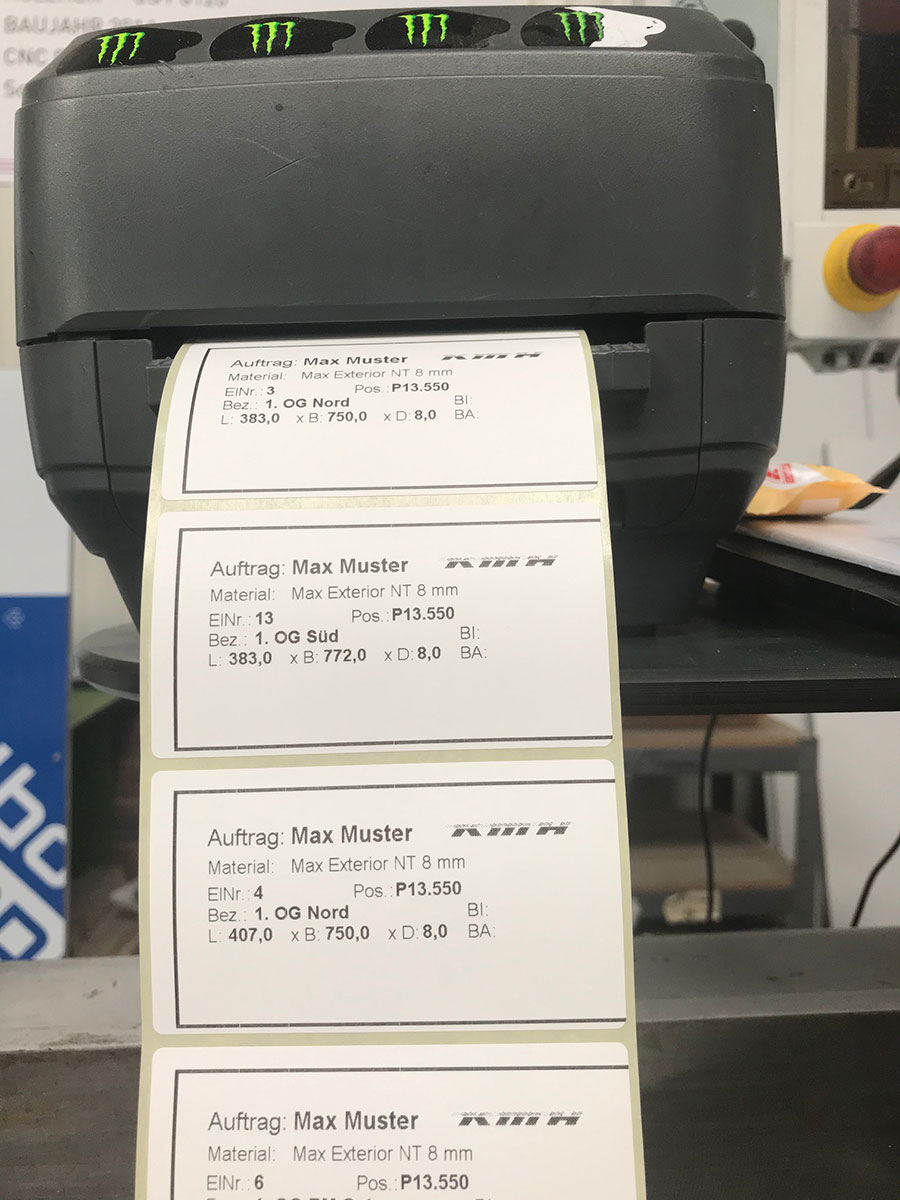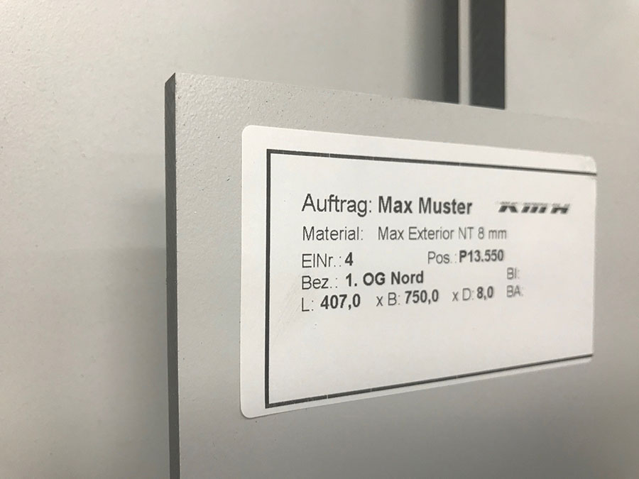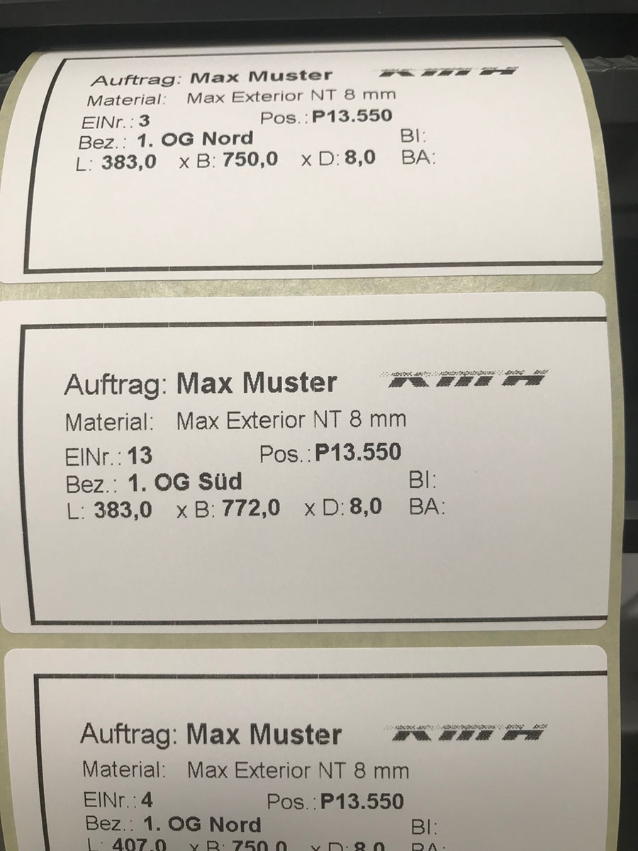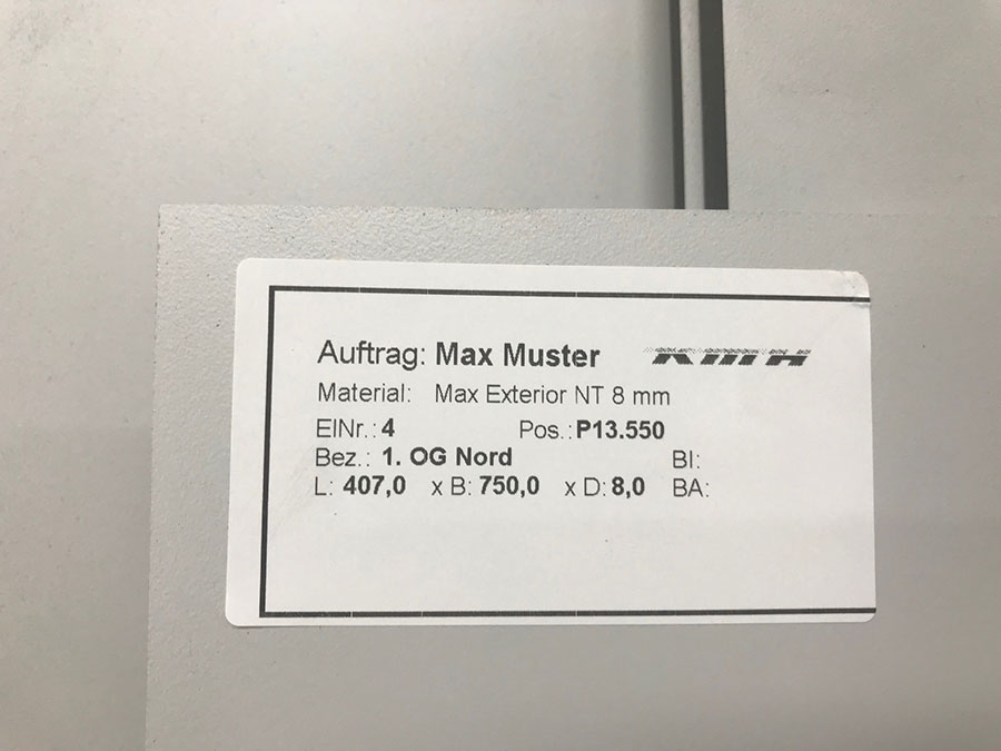 Um Sie bei der Wareneingangskontrolle, der Teile-Zuordnung im Maschinen- und Fassadenbau oder auch beim aufwändigen Digitaldruck zu unterstützen, haben wir die Möglichkeit Ihre Zuschnitte / Bauteile mit bis zu 3 Feldern je Etikett zu individualisieren. Somit ist eine klare und schnelle Zuordnung zu Stücklisten, Aufträgen, Projekten, Fassadenseiten usw. jederzeit schnell und unkompliziert möglich. Diese Dienstleistung ist für Sie kostenlos.