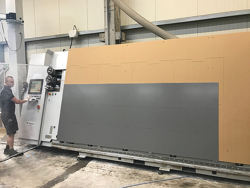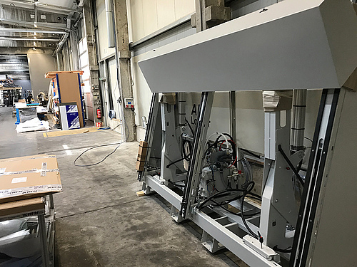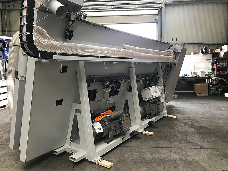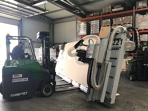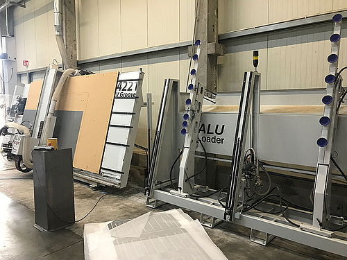 Diese zweite Casadei Vertikal-Anlage mit einer Bearbeitungsfläche von 4100 x 2100mm wurde, nach der positiven Erfahrung der Erweiterung des ersten Aggregates, ebenfalls mit der automatischen Ladestation AluLoader konfiguriert.